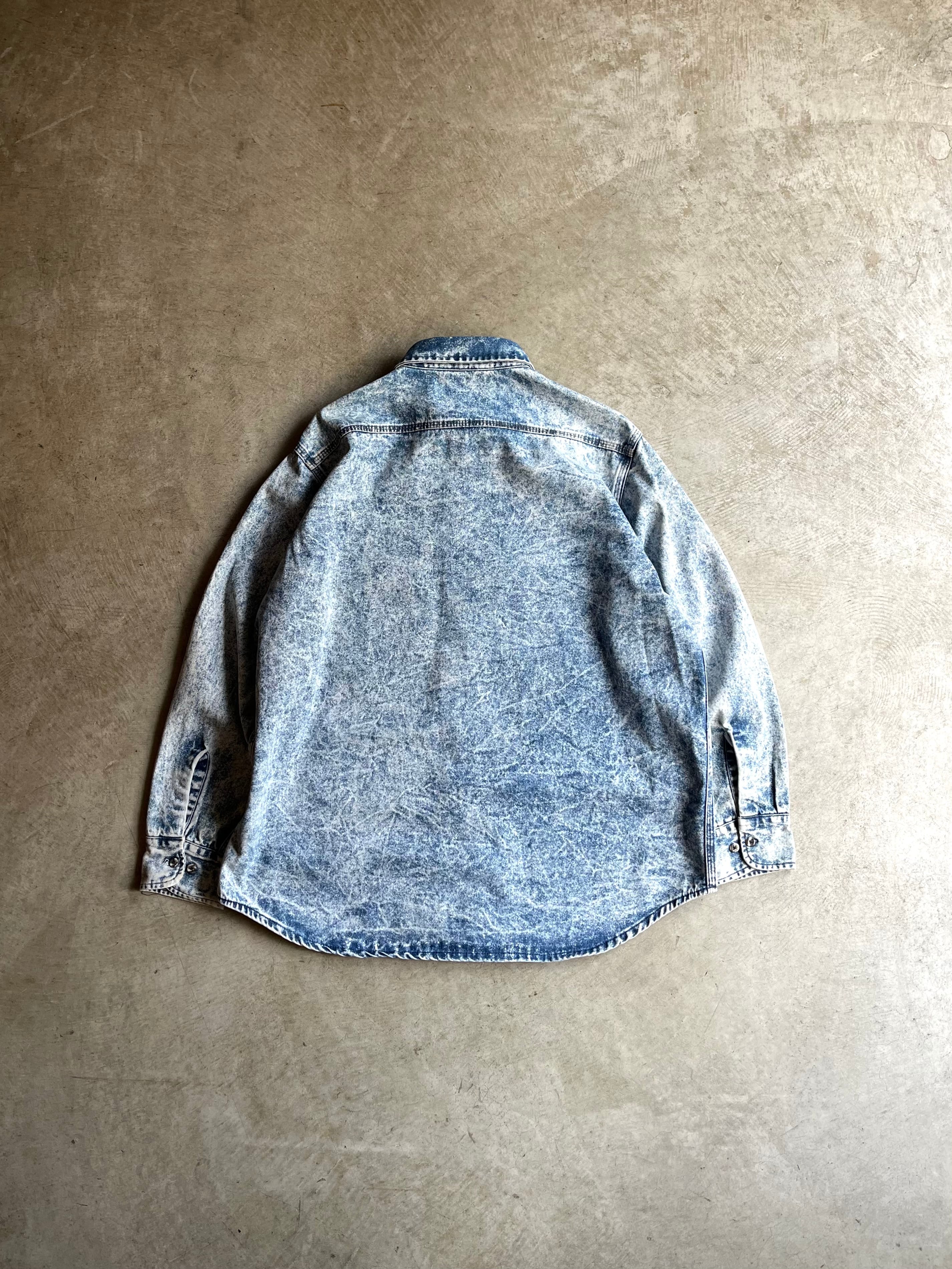 ケミカルウォッシュ加工されたデニムシャツ。
