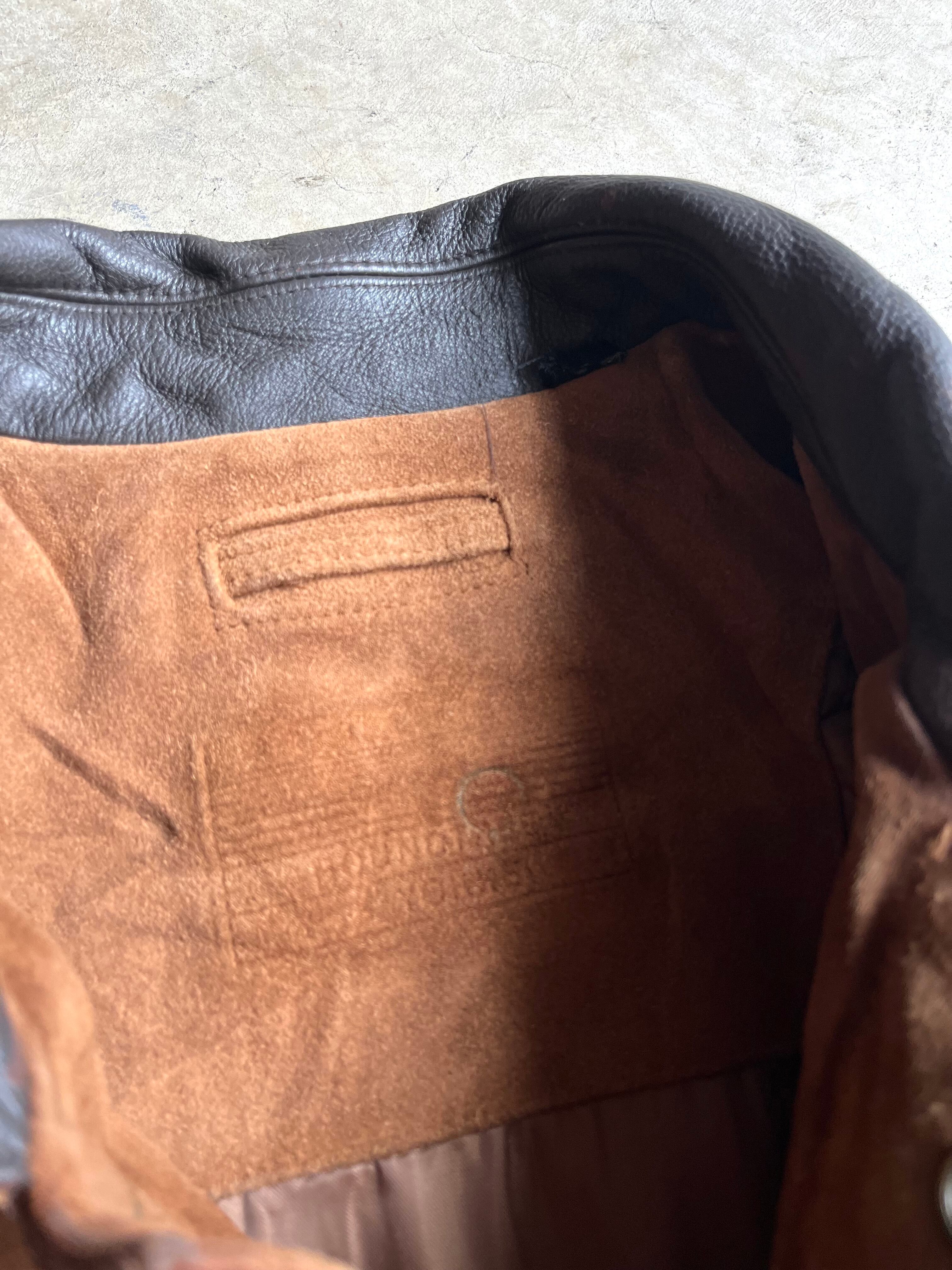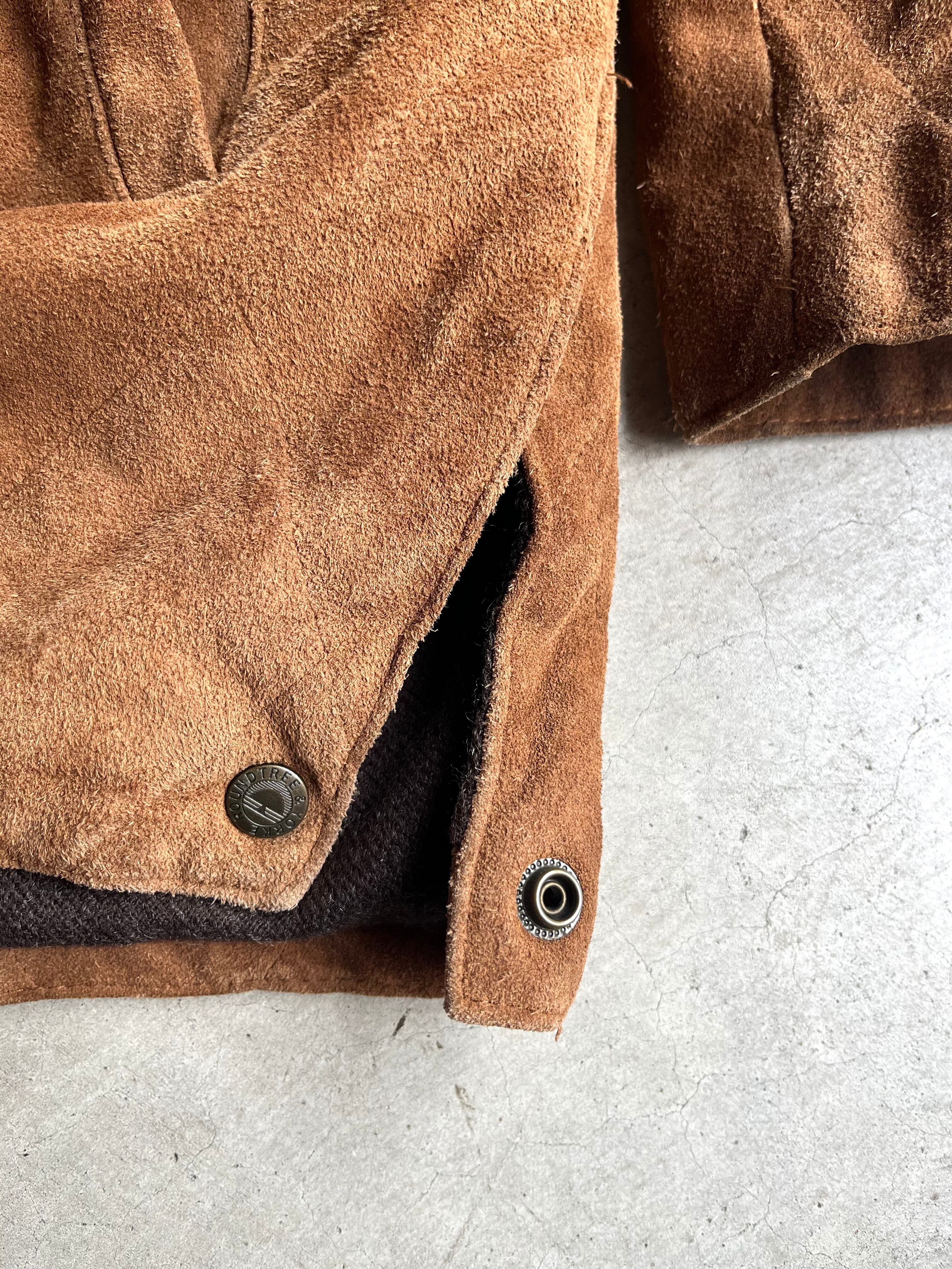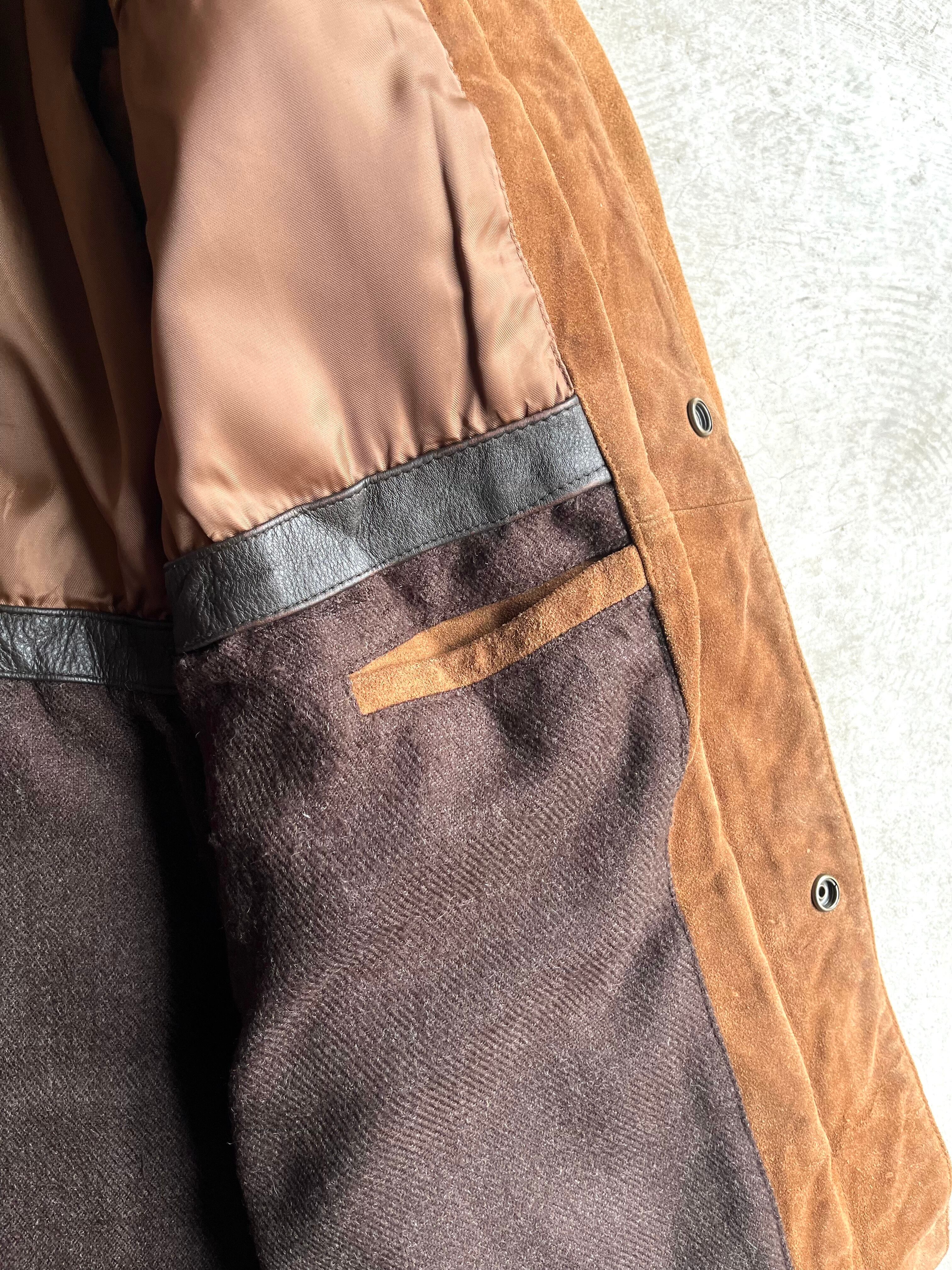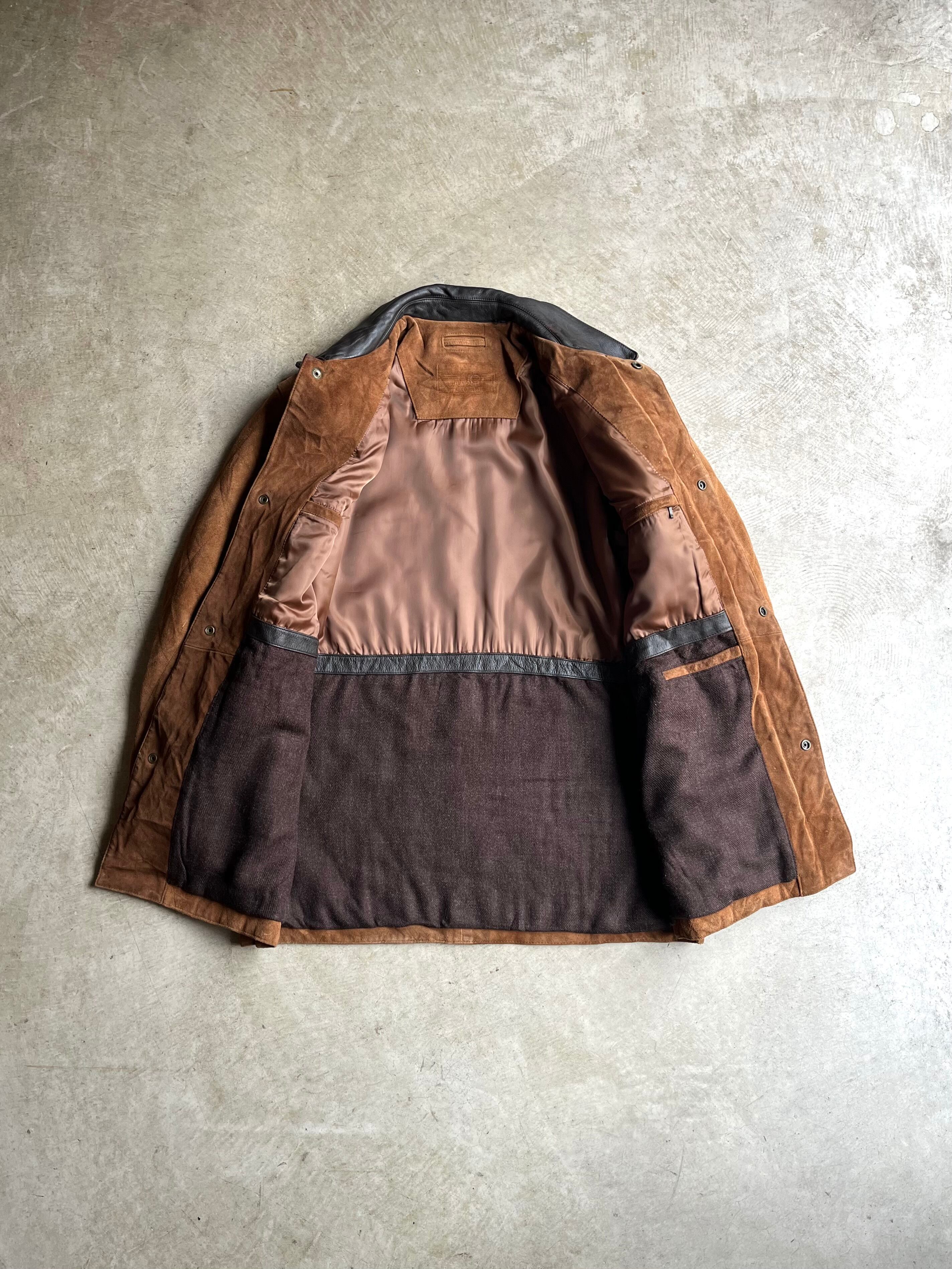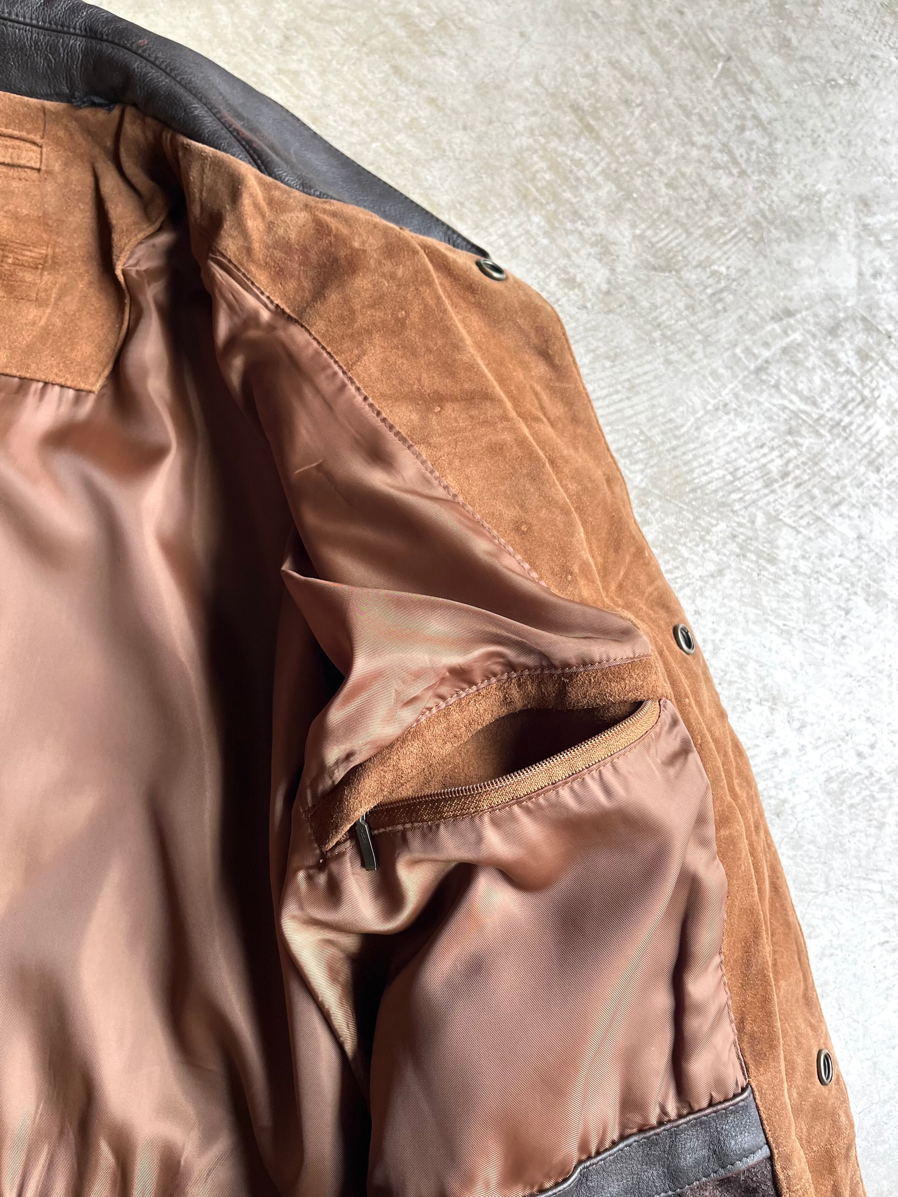 自然な温かみのある色合いのスエードボディと、襟部分のレザーのコントラストが特徴の一枚。