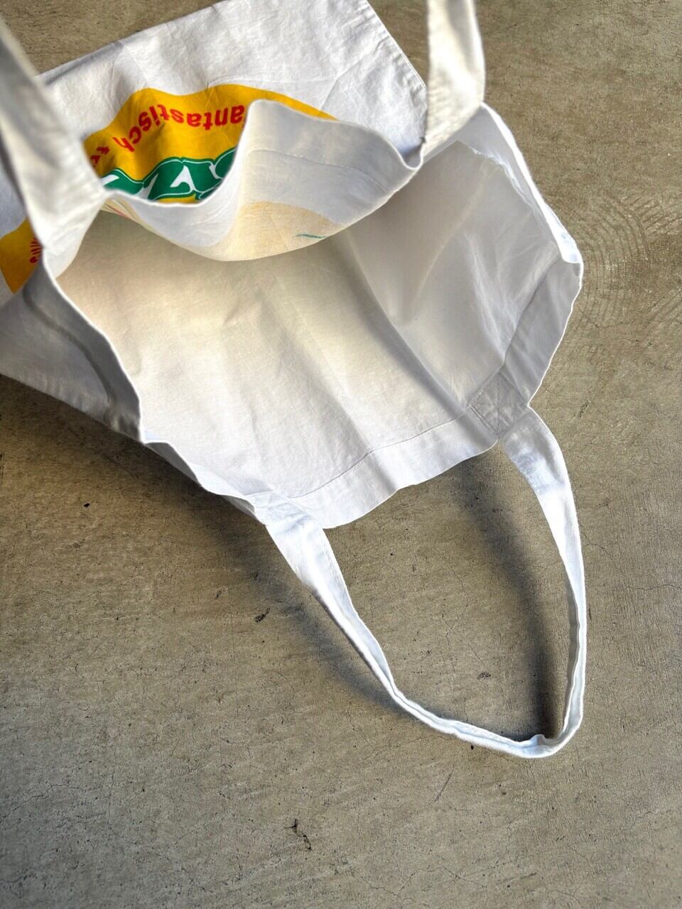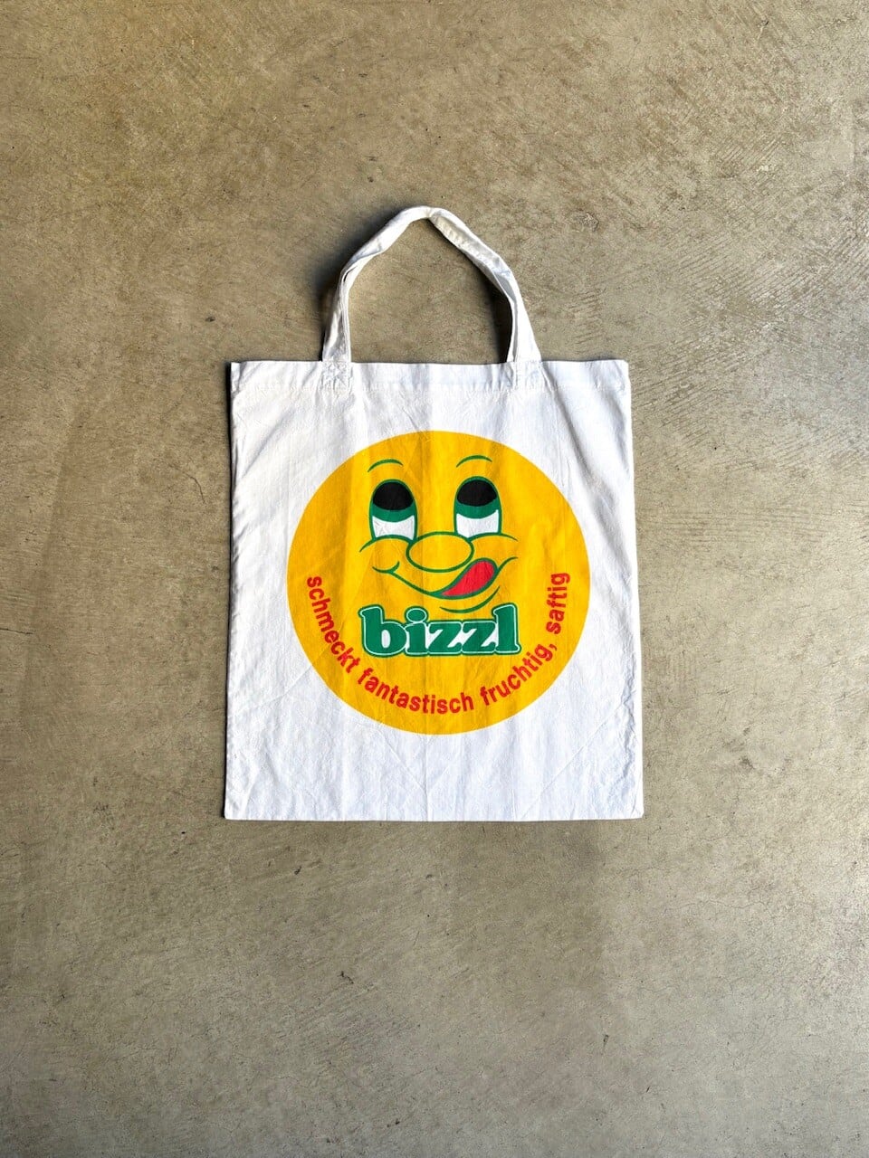 このトートバッグには、ドイツ語で「schmeckt fantastisch fruchtig, saftig」「驚くほどフルーティーでジューシーな味」というキャッチフレーズとブランドロゴがデザインされております。