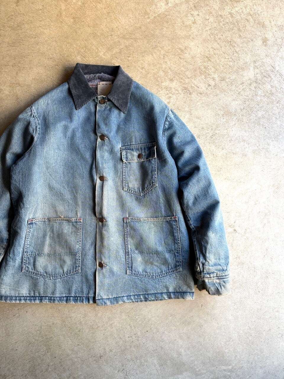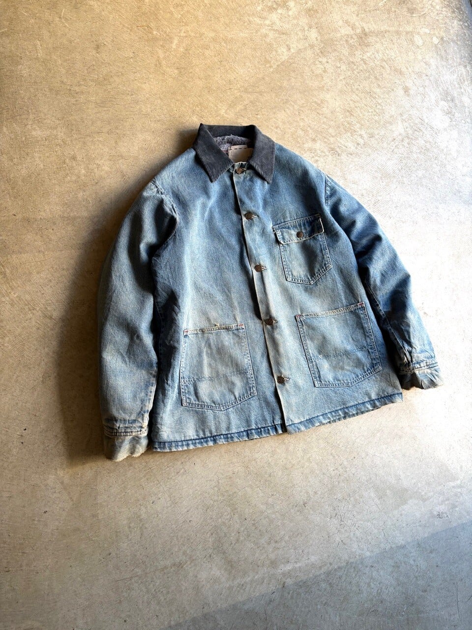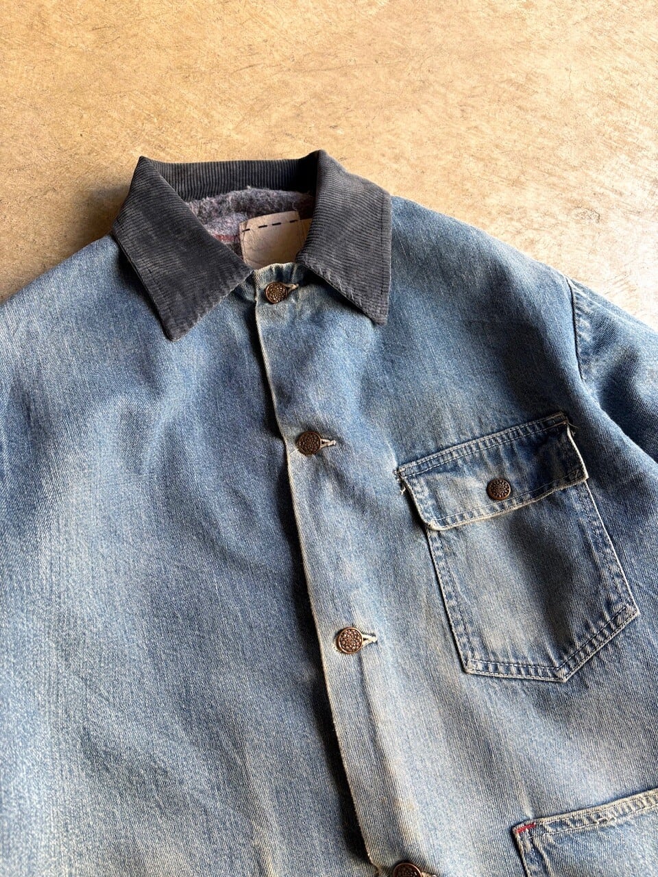 ライトオンスのインディゴデニムを使用しており、襟元はコーデュロイ素材の切り替え仕様。