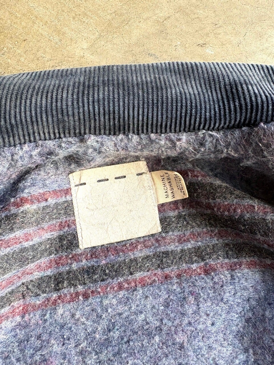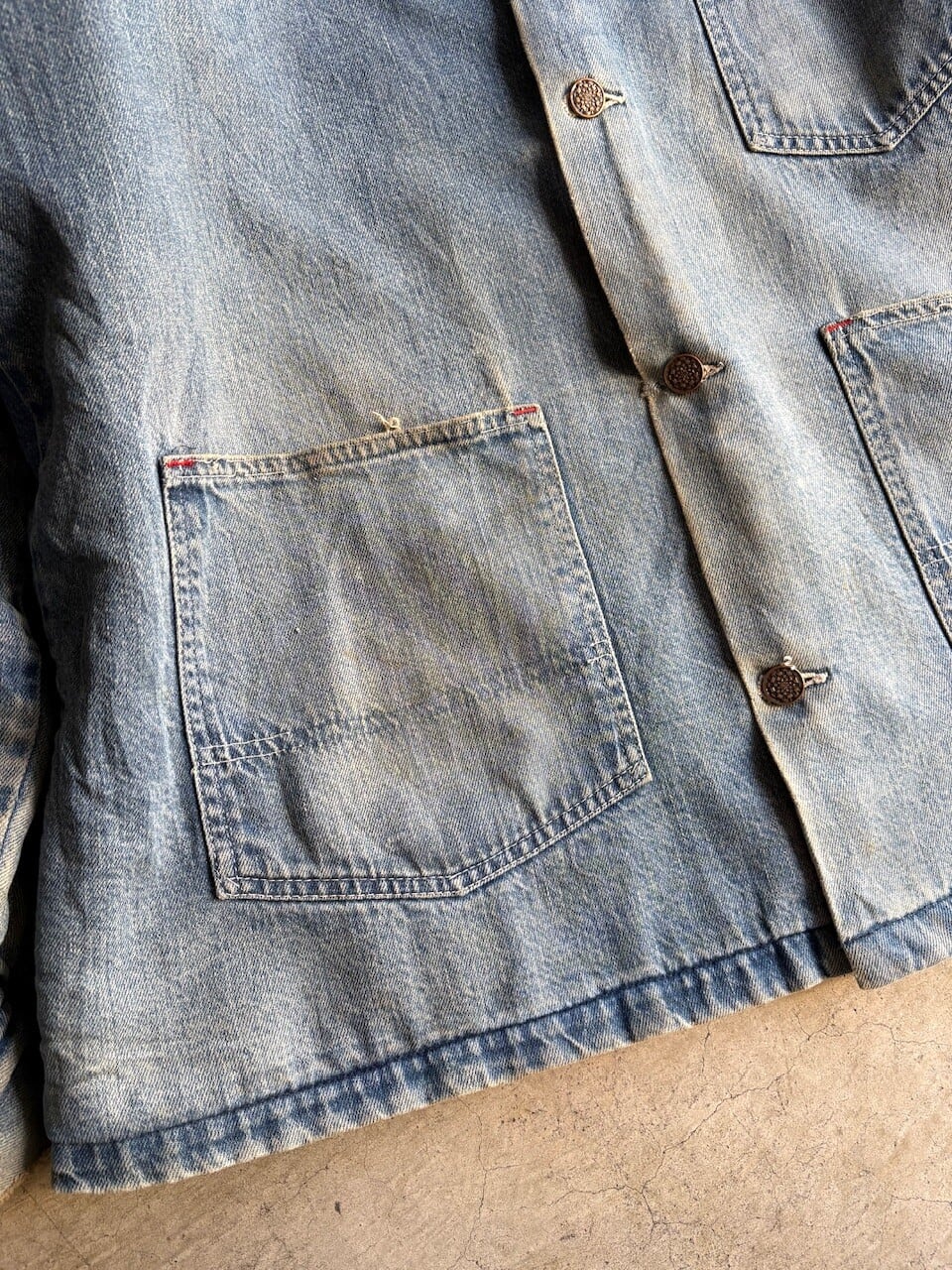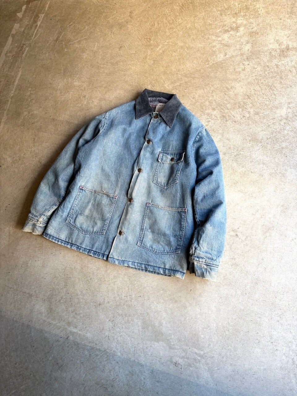 ライトオンスのインディゴデニムを使用しており、襟元はコーデュロイ素材の切り替え仕様。