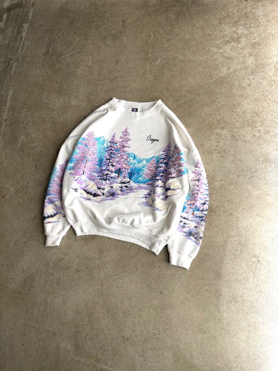 フロントからバック、袖にかけてパステルカラーのピンクやブルーで彩られたオレゴンの冬の森林風景がプリントが施された一枚。