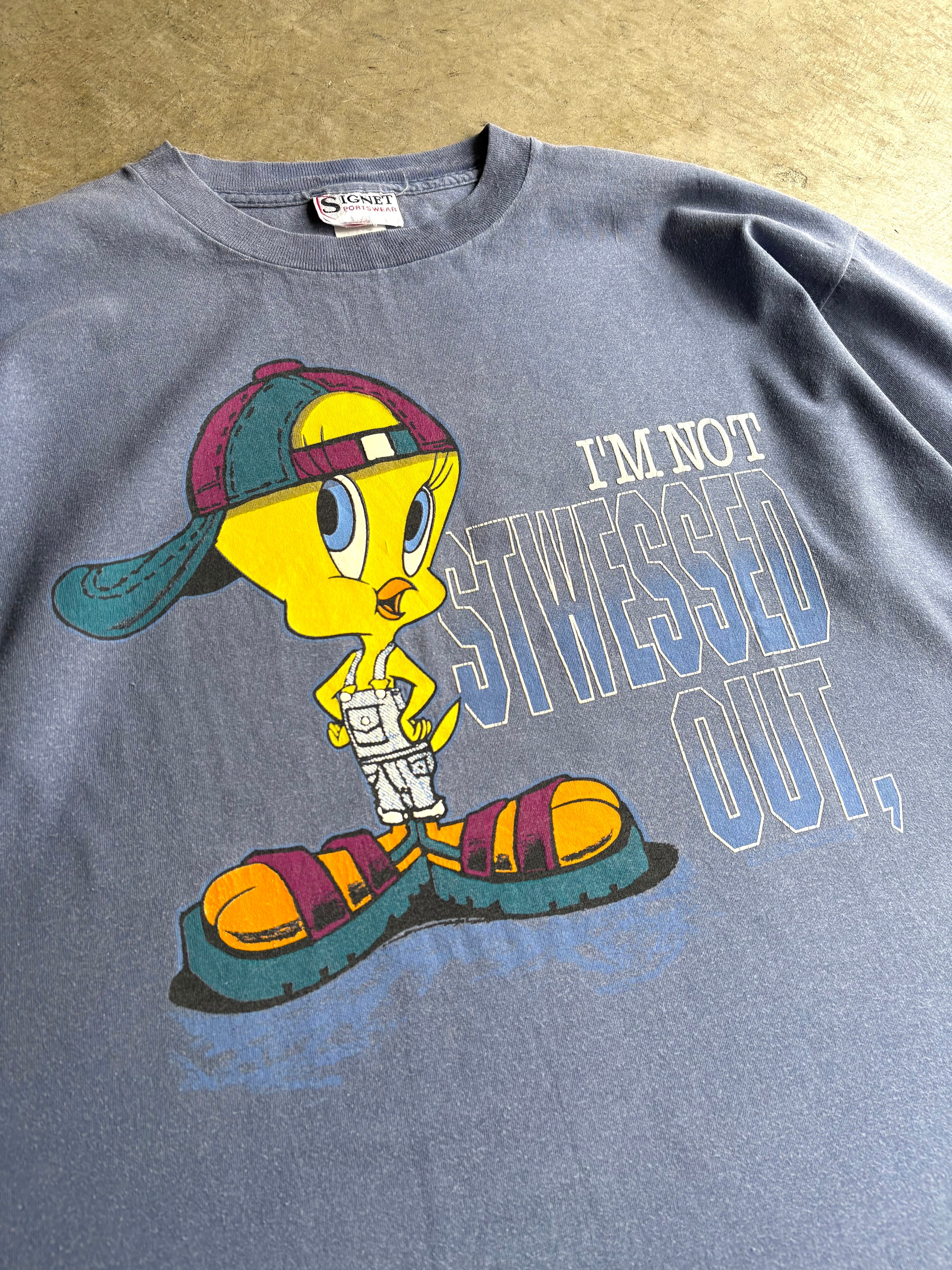 「LOONEY TUNES」のキャラクターである“TWEETY”が、後ろ向きにかぶったキャップ姿と「I'M NOT STWESSED OUT,」(まだストレスは溜まっていないよ)というユーモラスなフレーズがプリントされた、インパクトのある一枚。